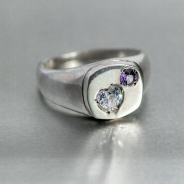 Anillo de plata con una circonita engastada en forma de corazón y otra en forma de estrella.